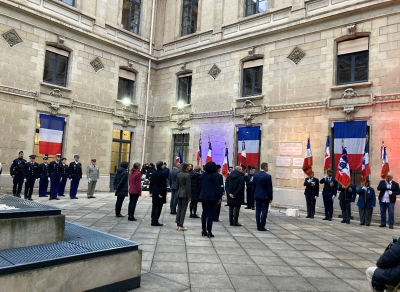 A l’issue d’un dépôt de gerbe en présence de sa petite fille, au pied de la plaque commémorative apposée dans une cour du bâtiment, Mme Fabienne Buccio, préfète de la région Auvergne Rhône-Alpes, préfète du Rhône, a retracé la vie et le destin de cet éminent serviteur de l’Etat entrée en Résistance.