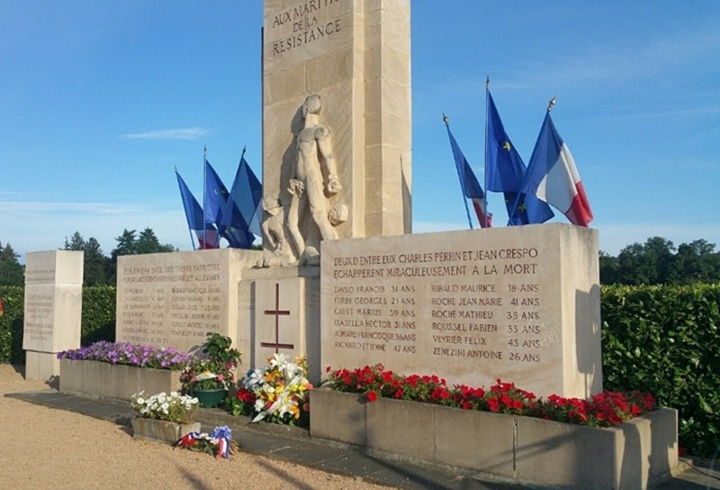 Les Allemands les font monter dans une camionnette, où ils sont entassés, enchaînés deux par deux et surveillés par quatre allemands dont les mitraillettes sont braquées sur eux. La camionnette est précédée et suivie par deux tractions avant où ont pris place les tueurs. Après un arrêt dans la cour du bâtiment de la Gestapo à Bellecour, ils reprennent la route pour s’arrêter là où nous sommes aujourd’hui, sur cette route qui, à l’époque était bordées de haies assez hautes et de barbelés.