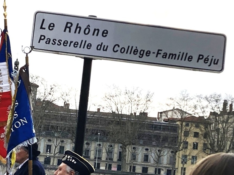 En présence de plusieurs membres de l’association des Rescapés de Montluc, la Passerelle de Collège reliant au-dessus de Rhône, les 2e et 6e arrondissements de Lyon, a reçu l’appellation officielle de « Passerelle du Collège-Famille Péju »